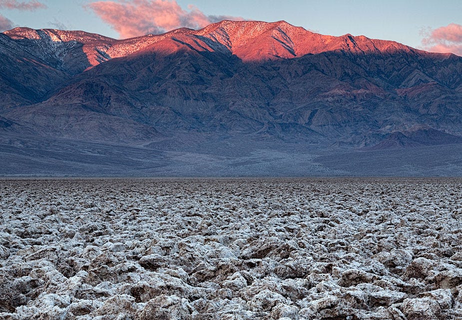 Tee off with Beelzebub. Devil's Golf Course, photographed over two consecutive mornings in December 2012 with the superb Canon TS-E 90mm f/2.8 lens. The tilt movement permits control of the depth of field in the plane of the salt pan. Sunrise at Devil's Golf Course in Death Valley